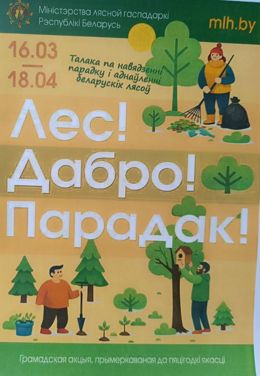 15 апреля 2026 года представители Гродненской областной инспекции Госстандарта, в том числе члены первичной организации общественной организации Госстандарта общественного объединения «Белорусский союз женщин», члены первичной профсоюзной организации Гродненской областной инспекции Госстандарта Белорусского профессионального союза работников отраслей промышленности «БЕЛПРОФМАШ» приняли участие в добровольной общественной акции «Лес! Дабро! Парадак!». Сотрудники инспекции приводили в порядок места отдыха на территории регионального лесного экологического образовательного центра «Парк Горни» в Лидском районе.