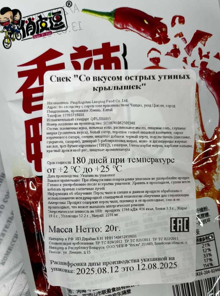 Гродненская областная инспекция Госстандарта в результате проведенных надзорных мероприятий выявила потенциально опасную продукцию – снек «Со вкусом острых утиных крылышек», который не соответствует требованиям технических регламентов Таможенного союза ТР ТС 021/2011 "On food safety", TR TS 022/2011 “Food products in terms of their labeling”, TR TS 029/2012 "Safety requirements for food additives, ароматизаторов и технологических вспомогательных средств» по безопасности и маркировке в части предоставления достоверной информации о продукте: при производстве пищевой продукции применялись заявленные в маркировке недопустимые пищевые добавки; в маркировке продукции не указано функциональное (technological) назначение пищевых добавок; наименование продукции не сопровождается надписью «с сахаром (сахарами) и подсластителем (подсластителями)».
